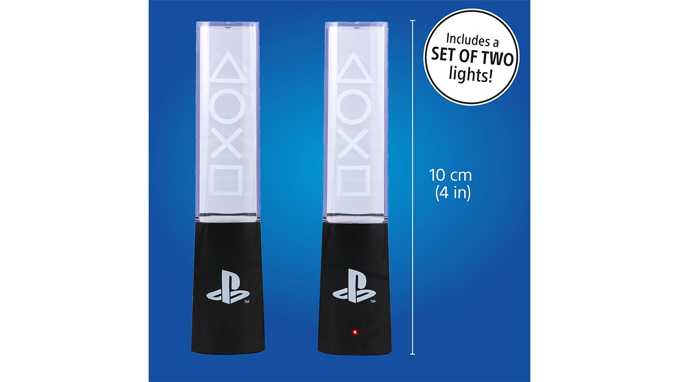 Bring your love of gaming to life with these PlayStation Liquid Dancing Lights. The set of two 22cm (8.7") tall lights have blue and white LEDs as well as four water jets inside. Play your favourite music nearby and watch the lights change colour and splash along to the beat. Power the lights with the included USB cable. The PlayStation Liquid Dancing Lights will make a fun addition to your home.