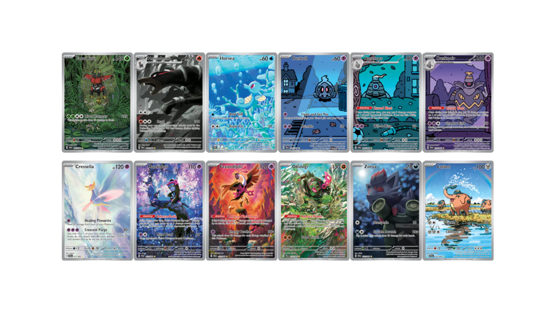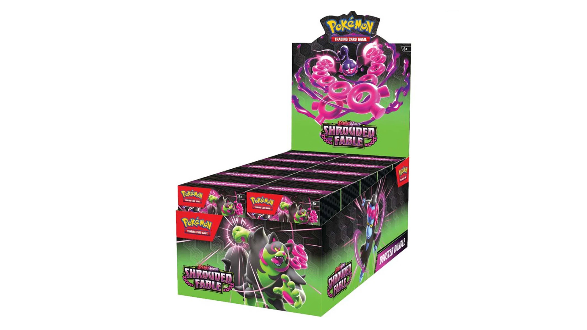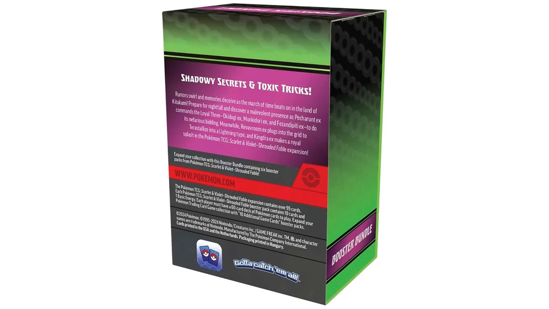 Rumors swirl and memories deceive as the march of time beats on in the land of Kitakami! Prepare for nightfall and discover a malevolent presence as Pecharunt ex commands the Loyal Three—Okidogi ex, Munkidori ex, and Fezandipiti ex—to do its nefarious bidding. Meanwhile, Revavroom ex plugs into the grid to Terastallize into a Lightning type, and Kingdra ex makes a royal splash in the Pokémon TCG: Scarlet & Violet—Shrouded Fable expansion!